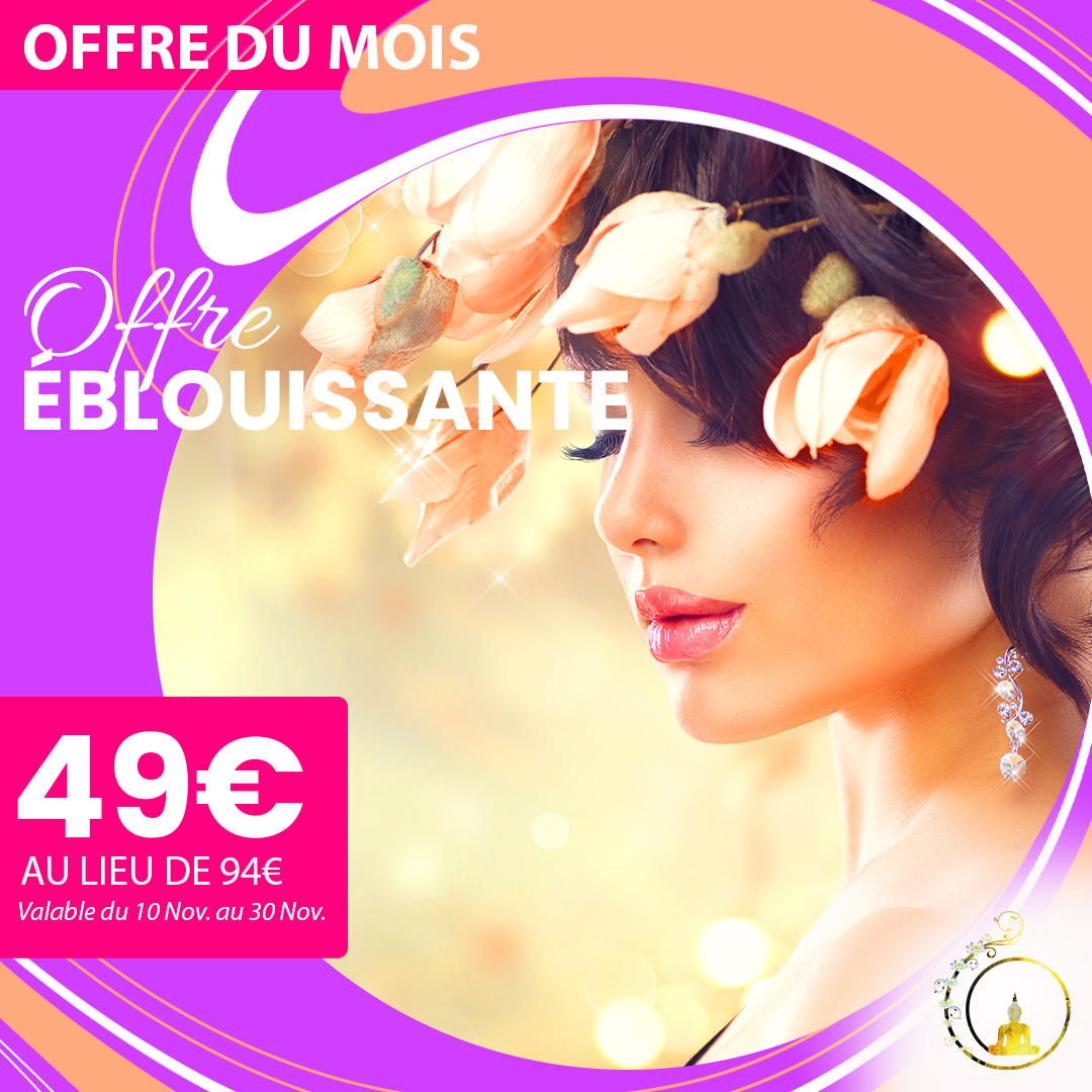 + 1 Soin complet du visage (Acheté) + 1 Massage du dos de 20min (Offert) + 1 Gommage du dos (Offert) + 1 Soin du buste (Offert) = Le tout pour 49 € au lieu de 94 € (Durée du soin 2H00)